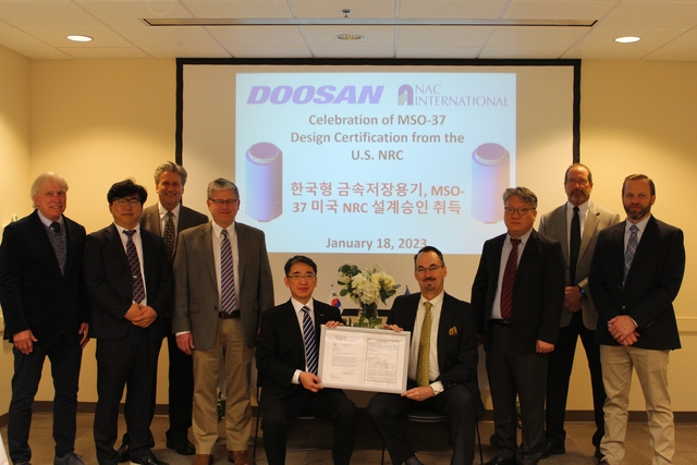 Representatives of Doosan Enerbility visited NAC International’s office in Peachtree Corners, GA January 17-18, 2023, to celebrate the effective date of Amendment 10 to the U.S. Nuclear Regulatory Commission (NRC) Certificate of Compliance (CoC) 72-1031 for NAC’s MAGNASTOR® ultra-high capacity storage system for spent nuclear fuel.