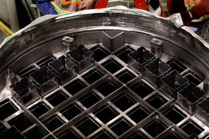 To shield the radiation, the fuel will be sealed in five stainless steel canisters with half inch thick walls and a honeycomb rack with boral “poison mats” to catch stray neutrons. Each canister weighs about 10 tons and cost upwards of $500,000. Loaded, it will tip the scales at 55,000 pounds.